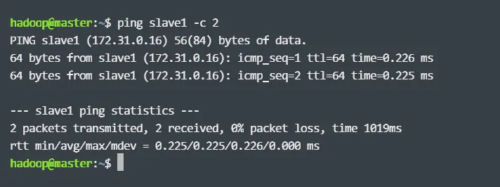 这样就完成了 master 节点和 slave 节点的配置,然后,需要在各个节点上都执行如下命令,测试是否相互 ping 得通,如果 ping 不通,后面就无法顺利配置成功: