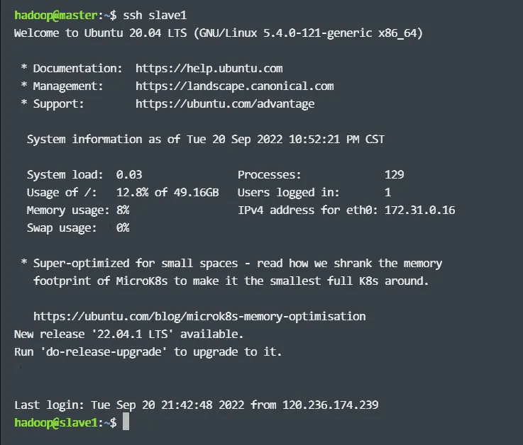 会显示如下结果,显示已经登录到 slave1 节点上。