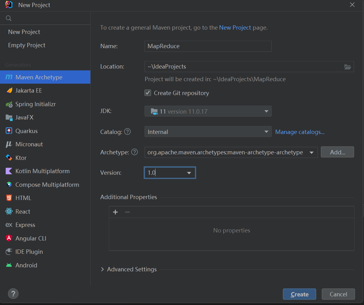 File->New Project,选择Maven Archetype,创建一个名为MapReduce的 Maven 项目: